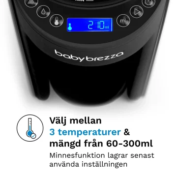 Baby Brezza Formula Pro Advanced är en helautomatisk välling- och ersättningsmaskin som tillreder en varm flaska på bara några sekunder. Maskinen blandar pulver och vatten till rätt konsistens varje gång utan klumpar eller luftbubblor. Du kan enkelt välja mellan tre temperaturinställningar (kroppstemperatur, varmare än kroppstemperatur, rumstemperatur) och dosera från 60–300 ml i steg om 30 ml. Den fungerar med nästan alla pulversorter och flasktyper på marknaden. Enkel att rengöra och använda med tydlig LCD-display. BPA-FRI. Produktens mått: B 19 cm, D 30 cm, H 38 cm.