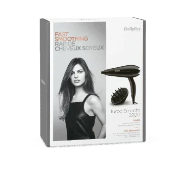 BaByliss Hårfön Turbo Smooth 2200 D572DE är en lätt och effektiv hårfön med 2 200 W och snabbgående luftflöde som torkar håret snabbt och effektivt. Hårfönen har 3 värmelägen/2 hastigheter och en knapp för kalluft, nätsladd som är 1,95 m. Den har Keramisk turmalin och joniserande effekt som slätar ut hårstråna, ger extra glans och motverkar flygigt och frissigt hår. En stor diffusor som förstärker naturliga lockar och ett smalt munstycke för släta frisyrer.