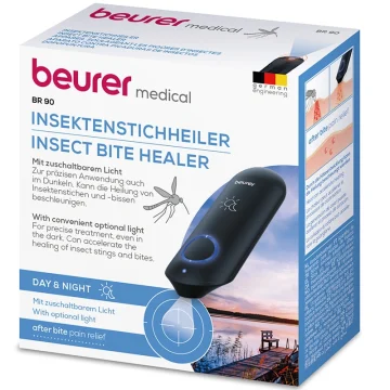Beurer BR90 Klidämpare är en snabbuppvärmd keramisk platta som hjälper till att lindra klåda och minskar känslan av obehag efter insektsbett eller stick. Med två program, ett för känslig hy och ett för normal hy, som värmer upp plattan till ca 50°C och ger en behandling på 3 respektive 6 sekunder. Utrustad med en praktisk ljuskälla som gör det enkelt att använda klidämparen även i mörker. Batterier medföljer. 5 års garanti.