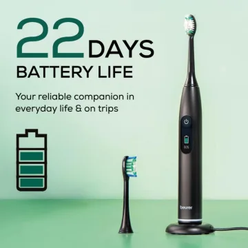 Beurer SC 50 är en eltandborste med sonisk teknologi som med cirka 80 000 rörelse per minut rengör dina tänder effektivt och skonsamt. Den har fem olika rengöringslägen för daglig rengöring, extra skonsam, blank finish, vårda tandköttet och för att ta bort missfärgningar. En LCD-display visar vilket borstläge du valt, batterinivå och timerstatus. Den har en 2-minuters timer med 30-sekunders intervaller för att säkerställa en optimal borsttid. En inbyggd trycksensor som varnar vid för hårt tryck för att skydda tänder och tandkött. Den är tillverkad av 100 % återvunnet material.