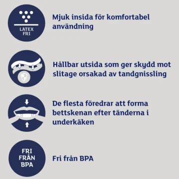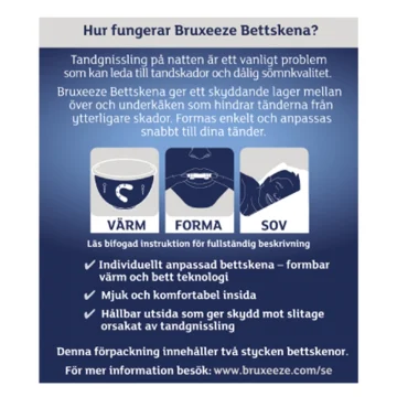 Bruxeeze Night Guard är en bettskena mot tandgnissling avsedd att användas när du sover. Individuellt anpassad bettskena med formbar värm och bett-teknologi, formas och anpassas för tänderna i över- eller underkäken, för bästa komfort. Med en hållbar utsida som ger skydd mot slitage orsakat av tandgnissling. 2 bettskenor per förpackning.
