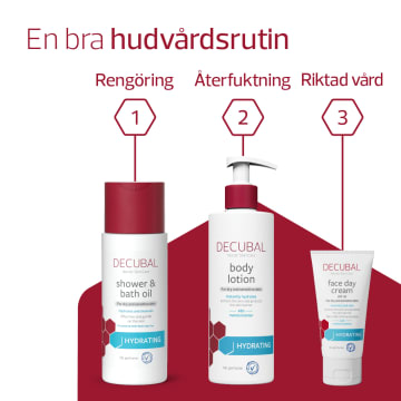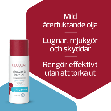 Decubal Shower & Bath Oil är en mild duscholja med naturlig jojobaolja som rengör utan att torka ut huden. Innehåller mjukgörande E-vitamin och lugnande kamomill. Passar torr eller mycket torr hud. Välj mellan två olika förpackningsstorlekar. Fri från parfym och konserveringsmedel. 200 ml.