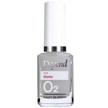Depend O2 Top Matte topplack som ger en läckert matt finish samtidigt som nageln skyddas och nagellacket sitter på plats extra länge. Torkar snabbt och är lätt att applicera. 11 ml.