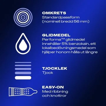 - Innehåller ett speciellt fördröjande glidmedel med bensokain på insidan