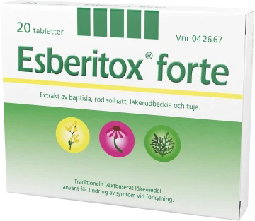 Dosering Vuxna, äldre och barn över 12 år: 1 tablett 2 gånger dagligen. Esberitox® forte ska inte ges till barn under 12 år. Vid förkylningssymtom bör behandlingen starta så snabbt som möjligt. Esberitox® forte ska inte användas längre än 10 dagar per behandlingstillfälle. Kontakta läkare eller annan sjukvårdspersonal om symtomen kvarstår efter 10 dagar eller om biverkningar som inte nämns i bipacksedeln uppträder. Använd inte Esberitox® forte om du – är allergisk mot röd solhatt eller andra korgblommiga växter (t ex gråbo). – har en pågående systemisk sjukdom (t.ex. reumatoid artrit, multipel skleros eller andra autoimmuna sjukdomar) eller nedsatt immunförsvar. Esberitox® forte rekommenderas inte till atopiker och gravida eller ammande kvinnor. Förvaras utom syn- och räckhåll för barn. Läs bipacksedeln före användning. Receptfritt läkemedel.