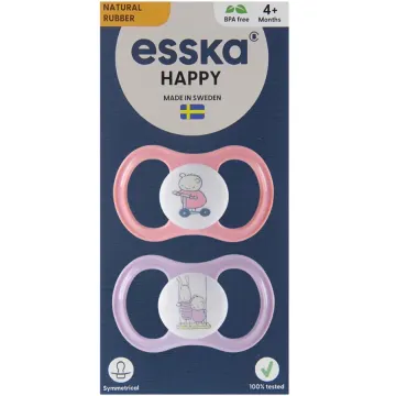 ESSKA Happy 4+m Latex Rosa är en napp med symmetrisk sugdel. Nappen är alltid rättvänd och har en ventilerad sköld som är snäll mot barns känsliga hud. Sugdelen är gjord i slitstark och högkvalitativ naturgummi som är flexibelt, mjukt och motståndskraftigt mot barns tänder. Tillverkad i Sverige. 2-pack.