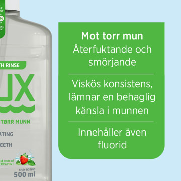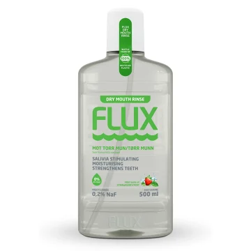Flux Dry Mouth är en munskölj som stimulerar salivproduktionen, återfuktar och smörjer slemhinnan vid muntorrhet. Innehåller fluor som minskar risken för karies. Använd morgon och kväll vid behov. Jordgubb/mintsmak. Sockerfri. 500 ml.