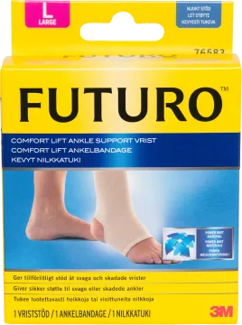 Futuro Comfort Fotled är ett fotledsstöd som kan användas i skor. Det ger stöd till svaga eller stela fotleder. Det stretchiga stickade materialet är mjuk och släpper genom luft. Fotstödet har inga skenor, utan lindrar smärta genom kompression och värme. Det finns i olika storlekar. Storleksöversikt (mät omkretsen runt hälen och ankeln): Small: 25,4-31,8 cm Medium: 31,8-38,0 cm Large: 38,0-44,5 cm