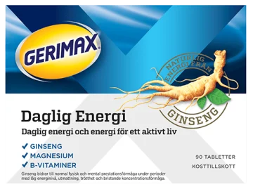 Gerimax Daglig Energi är ett kosttillskott för energi med ginseng. Den innehåller vitamin B2, B6, B12, folsyra och pantotensyra som bidrar till att minska trötthet och utmattning, Vitamin C och E samt mineralerna selen och zink som bidrar till att skydda cellerna från oxidativ stress och vitamin B1 samt koppar som bidrar till normal energiomsättning. För vuxna över 18 år. 90 st.