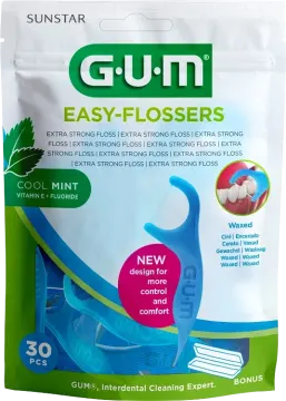 GUM Easy-Flossers Tandtrådsbygel har en extra hållbar vaxad tandtråd på byglar med fluor och vitamin E samt smak av mint. Lättanvänd tandtrådsbygel som effektivt tar bort plack och matrester mellan tänderna. 30st.
