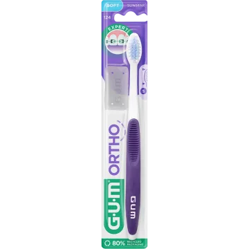 GUM Ortho Tandborste är en tandborste för dig med tandställning. Tandborsten har V-klippt kompakt borsthuvud med mjuka strån. Gör skonsamt rent tänderna och runt tandställningar. 1 st.