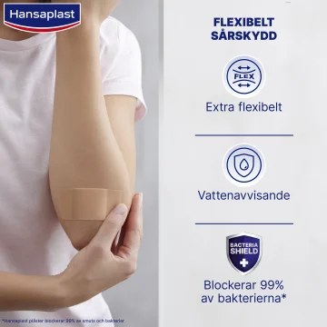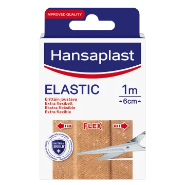 Hansaplast Elastic är ett extra flexibelt plåster tillverkat i textilmaterial. Materialet är andningsbart och vattenavvisande och skyddar såret från vatten, smuts och bakterier. Den flexibla strukturen rör sig med huden vilket gör att plåstret kan fästas på leder som knän och armbågar. Klipps till önskad storlek. 1 m x 6 cm. 1 st.