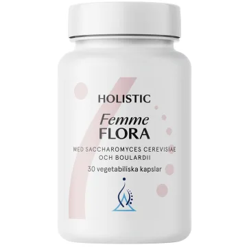 Holistic Femme Flora är ett kosttillskott med jästorganismer för kvinnors intima mikroflora. Innehåller minst 9 miljarder jästorganismer per daglig dos från stammarna S. cerevisiae (ibSium®) och S. cerevisiae boulardii (Lynside® Pro SCB PW). Berikad med vitamin C som bidrar till immunsystemets normala funktion. Vegansk. 30 vegetabiliska kapslar.