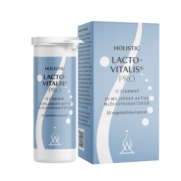 Holistic Lactovitalis Pro är ett kosttillskott med minst 20 miljarder mjölksyrabakterier från 12 olika stammar per kapsel. Innehåller bland annat den välstuderade L. rhamnosus GG. Kombinerat med C-vitamin som bidrar till immunsystemets normala funktion och vitamin B2 som bidrar till att bibehålla normala slemhinnor. Alla bakteriekulturer är mjölkfria. Patenterad teknik som skyddar de känsliga mjölksyrabakterierna på dess väg till tarmen. Burken är tillverkad av 96% biobaserad plast. Vegansk. 30 kapslar.