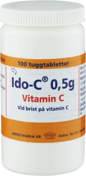 Ido-C tuggtablett 0,5 g är C-vitamin i form av tuggtabletter. C-vitamin bidrar till att minska trötthet och utmattning. Intas vid konstaterad brist på C-vitamin. Med apelsinsmak. 100 st
