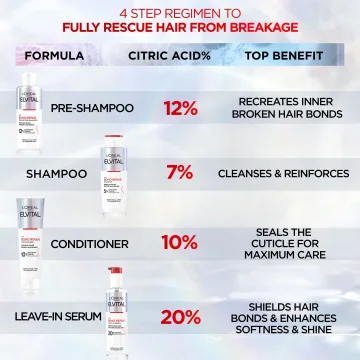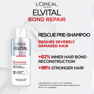 L'Oréal Paris Elvital Bond Repair Pre-Shampoo är ett reparerande förschampo som används innan schamponering av håret. Förschampot används innan det vanliga schampot och är en del av en hemmabehandling som hjälper till att återuppbygga bindningar i hårets struktur och reparera hårstrånas fjällskikt. Förschampot fungerar som en extra kur som stärker och återuppbygger hårstråna, samtidigt som det förbereder håret för efterföljande schampo och balsam. Passar hår som skadats till följd av slitage från borstning, blekning, värmeredskap och färgning. Passar även torrt till mycket torrt hår. Med en härlig doft av grapefrukt, exotiska blommor och färska bär. 200 ml. Används gärna tillsammans med övriga produkter i Elvital Bond Repair-serien. Förschampot är steg 1 i Elvitals Bond Repair hemmabehandling.