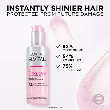 L'Oréal Paris Elvital Glycolic Gloss Leave-in Serum är ett intensivt vårdande serum för frissigt, matt och glanslöst hår. Serumet är en del av Elvitals Glycolic Gloss-serie som hjälper till att återställa fibrerna hos skadat hår, förbättra hårets kvalitet och ge långvarig glans. Hårserumet innehåller 14% Gloss Complex som är berikat med glykolsyra och hjälper till att försegla hårets ytskikt för att reparera skador, minska frissighet och motverka framtida slitage. Glykolsyra är en AHA-syra som tränger ned i hårfibrerna och bidrar till att lösa upp överflödig olja och produktrester, vilket ger ett friskt och fräscht hår. Formulan har även en mjukgörande och laminerande effekt som slätar ut håret och verkar glansgivande genom att håret lättare reflekterar ljus. Resultatet blir ett blankt hår med minskad frissighet. 150 ml. Används gärna tillsammans med övriga produkter i Elvital Glycolic Gloss-serien.