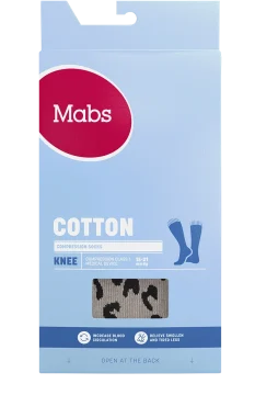 Mabs Cotton Knee Grey Leopard är en mjuk och skön kompressionsstrumpa med hög andel bomull för stöd i vardagen i ett snyggt och trendigt mönster. Strumpan är stickad i ett bekvämt, hållbart OEKO-tex certifierat material och av kompressionsklass 1 (15-21 mmHg) samt har en graderad kompression som är högst vid ankeln och avtar sedan upp mot knät. Vid långvarigt stillasittande eller stående kan benen och fötterna bli svullna och kännas tunga, spända och trötta. Även graviditet, övervikt och flygresor kan orsaka svullna fötter och ben. Genom att använda en kompressionsstrumpa ökar blodflödet i benen så att de känns pigga och starka hela dagen, oavsett du står går eller sitter mycket. Medicinteknisk produkt, läs bipacksedeln noga innan användning. Medicinska kompressionsstrumpor erbjuder kompressionsterapi med medicinsk kompression klass I som har en vetenskapligt bevisad effekt. Medicinska kompressionsstrumpor bör inte förväxlas med övriga strumpor som har en lägre kompressionsnivå och ingen vetenskapligt evidensbaserad effekt. För att hitta din strumpstorlek och för att passformen ska bli perfekt finns det tre mått du bör utgå ifrån: 1) Omkretsen runt ankeln där den är som smalast (A). 2) Omkretsen runt vaden där den är som bredast (B). 3) Din skostorlek (C). Storleksöversikt: Storlek S: Omfång ankel: 18-21 cm (A), Omfång vad: 28-34 cm (B), Skostorlek: 36-38 ( C), Strumpans längd: 33 cm Storlek M: Omfång ankel: 20-23 cm (A), Omfång vad: 31-37 cm(B), Skostorlek: 38-40 ( C), Strumpans längd: 35 cm Storlek L: Omfång ankel: 22-25 cm (A), Omfång vad: 34-40 cm(B), Skostorlek: 40-42( C) Strumpans längd: 37 cm Storlek XL: Omfång ankel: 24-27 cm (A), Omfång vad: 37-43 cm(B), Skostorlek: 43-44( C), Strumpans längd: 39 cm Storlek XXL: Omfång ankel: 26-29 cm (A), Omfång vad: 40-46 cm(B), Skostorlek: 44-47( C), Strumpans längd: 41 cm