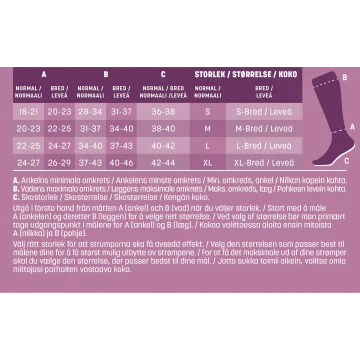 Mabs Nylon Knee Black Dotted är en tunn och elegant stödstrumpa med ett snyggt och trendigt mönster. Passar perfekt för festligare tillfällen eller för ett lite mer uppklätt intryck till vardags. Nylonstrumporna motverkar svullnad i benen utan att kompromissa med stilen på kontoret, på fritiden eller på festen. Strumporna når upp till knät och är stickade i en bekvämt nylonmaterial som motsvarar 140 denier och har kompressionsklass 1 (15–21 mmHg) som ger god komfort och ett bra stöd i vardagen. Vid långvarigt stillasittande eller stående kan benen och fötterna bli svullna och kännas tunga, spända och trötta. Även graviditet, övervikt och flygresor kan orsaka svullna fötter och ben. Genom att använda en kompressionsstrumpa ökar blodflödet i benen så att de känns pigga och starka hela dagen, oavsett du står går eller sitter mycket. Strumporna hjälper även till att motverka åderbråck. 1 par. Medicinteknisk produkt, läs bipacksedeln noga innan användning. Medicinska kompressionsstrumpor erbjuder kompressionsterapi med medicinsk kompression klass I som har en vetenskapligt bevisad effekt. För att välja rätt storlek och för att passformen ska bli perfekt finns det tre mått att utgå från: 1) Omkretsen runt ankeln där den är som smalast (A). 2) Omkretsen runt vaden där den är som bredast (B). 3) Din skostorlek (C). Storleksöversikt: • Storlek S: Omfång ankel (A): 18-21 cm, Omfång vad (B): 28-34 cm, Skostorlek: 36-38 ( C), Strumpans längd: 32 cm • Storlek M: Omfång ankel: 20-23 cm, Omfång vad: 31-37 cm, Skostorlek: 38-40 ( C), Strumpans längd: 34 cm • Storlek L: Omfång ankel: 22-25 cm, Omfång vad: 34-40 cm, Skostorlek: 40-42( C) Strumpans längd: 36 cm • Storlek XL : Omfång ankel: 24-27 cm, Omfång vad: 37-43 cm, Skostorlek: 42-44( C), Strumpans längd: 38 cm Hittar du inte en storlek som passar dig så finns Mabs Nylon även som Bred modell.