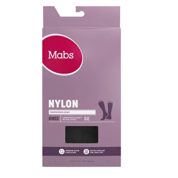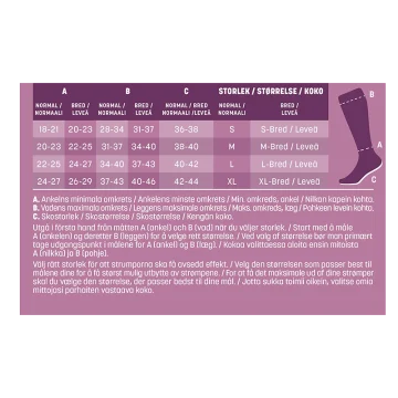 Mabs Nylon Knee Wide är en tunn och elegant kompressionsstrumpa som ger bra stöd och med en slät stickning och finish för en snygg look och skön passform. Strumpan har graderad kompression vilket ökar blodflödet i benen något som i sin tur motverkar trötthet, svullnad och åderbråck. Strumpan är stickad i ett bekvämt, hållbart OEKO-texcertifierat material och av kompressionsklass 1 (15-21 mmHg), 140 denier. Har en mjuk resårkant som minskar risken för stasning. Vid långvarigt stillasittande eller stående kan benen och fötterna bli svullna och kännas tunga, spända och trötta. Även graviditet, övervikt och flygresor kan orsaka svullna fötter och ben. Genom att använda en kompressionsstrumpa ökar blodflödet i benen så att de känns pigga och starka hela dagen, oavsett du står går eller sitter mycket. Strumporna hjälper även till att motverka åderbråck. 1 par. Medicinteknisk produkt, läs bipacksedeln noga innan användning. Medicinska kompressionsstrumpor erbjuder kompressionsterapi med medicinsk kompression klass I som har en vetenskapligt bevisad effekt. För att hitta din strumpstorlek och för att passformen skall bli perfekt finns det tre mått du bör utgå från: 1) Omkretsen runt ankeln där den är som smalast (A). 2) Omkretsen runt vaden där den är som bredast (B). 3) Din skostorlek (C). Storleksöversikt: Storlek S: Omfång ankel: 18-21 cm (A), Omfång vad: 28-34 cm (B), Skostorlek: 36-38 ( C), Strumpans längd: 32 cm Storlek M: Omfång ankel: 20-23 cm (A), Omfång vad: 31-37 cm (B), Skostorlek: 38-40 ( C), Strumpans längd: 34 cm Storlek L: Omfång ankel: 22-25 cm (A), Omfång vad: 34-40 cm (B), Skostorlek: 40-42( C) Strumpans längd: 36 cm Storlek XL : Omfång ankel: 24-27 cm (A), Omfång vad: 37-43 cm (B), Skostorlek: 42-44( C), Strumpans längd: 38 cm