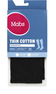 Mabs Thin Cotton Knee Black är en mjuk och bekväm stödstrumpa i tunt bomullsmaterial. Strumpan når upp till knät och har kompressionsklass 1 (15–21 mmHg) som ger god komfort och ett bra stöd i vardagen. De tunnare bomullsstrumporna passar extra bra för personer med varma fötter eller personer som upplever att vanliga stödstrumpor kan vara svåra att ta på. Vid långvarigt stillasittande eller stående kan benen och fötterna bli svullna och kännas tunga, spända och trötta. Även graviditet, övervikt och flygresor kan orsaka svullna fötter och ben. Genom att använda en kompressionsstrumpa ökar blodflödet i benen så att de känns pigga och starka hela dagen, oavsett du står går eller sitter mycket. Strumporna hjälper även till att motverka åderbråck. 1 par. Medicinteknisk produkt, läs bipacksedeln noga innan användning. Medicinska kompressionsstrumpor erbjuder kompressionsterapi med medicinsk kompression klass I som har en vetenskapligt bevisad effekt. För att välja rätt storlek och för att passformen ska bli perfekt finns det tre mått att utgå från: 1) Omkretsen runt ankeln där den är som smalast (A). 2) Omkretsen runt vaden där den är som bredast (B). 3) Din skostorlek (C). Storleksöversikt: • Storlek S: Omfång ankel: 18-21 cm (A), Omfång vad: 28-34 cm (B), Skostorlek: 36-38 ( C), Strumpans längd: 33 cm • Storlek M: Omfång ankel: 20-23 cm (A), Omfång vad: 31-37 cm(B), Skostorlek: 38-40 ( C), Strumpans längd: 36 cm • Storlek L: Omfång ankel: 22-25 cm (A), Omfång vad: 34-40 cm(B), Skostorlek: 40-42( C) Strumpans längd: 39,5 cm • Storlek XL: Omfång ankel: 24-27 cm (A), Omfång vad: 37-43 cm(B), Skostorlek: 43-44( C), Strumpans längd: 43,5 cm • Storlek XXL: Omfång ankel: 26-29 cm (A), Omfång vad: 40-46 cm(B), Skostorlek: 44-47( C), Strumpans längd: 47 cm