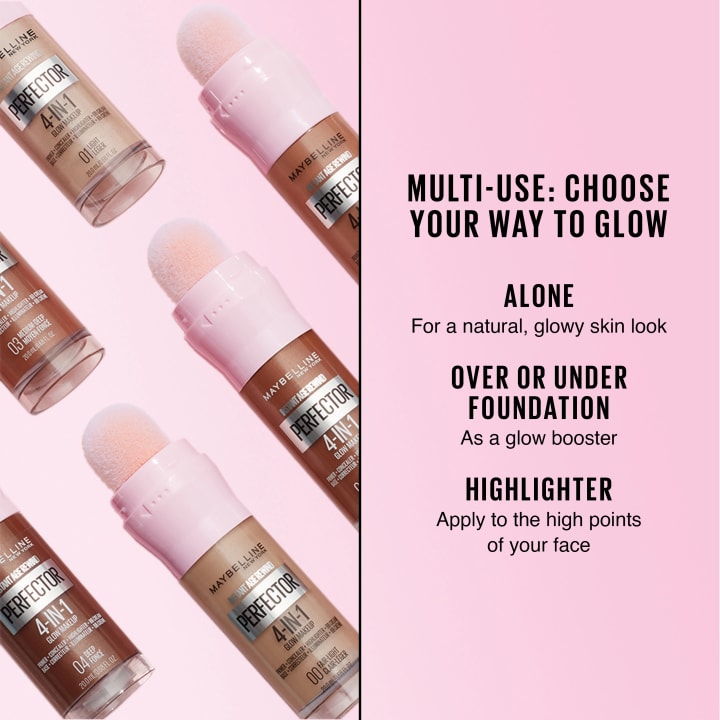 Maybelline New York Instant Perfector 4-in-1 Glow Makeup Foundation är en lystergivande foundation med lätt täckning. Den jämnar ut hudens textur och ger en strålande finish med massor av lyster. Foundationen har en inbyggd applikatorsvamp för en enkel och precis applicering och anpassar sig till hudtonen. Den går även att använda som en primer och som en highlighter. 20 ml.