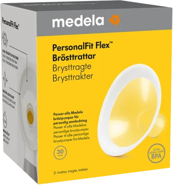 Medela PersonalFit Flex Brösttratt är ett tillbehör till Medela bröstpumpar som finns i olika storlekar. Tillsammans med forskare och ammande mammor har Medela utvecklat PersonalFit Flex som ger en helt ny typ av pumpning, anpassad för dig. Den återanvändningsbara tratten har en mjuk kant, vid öppningsvinkel och oval form som kan roteras 360 grader för att göra pumpningen bekvämare och ge möjligheten till en optimerad mjölkproduktion. Med brösttratten kan du enkelt anpassa bröstpumpens passform så att du hittar den mest bekväma och effektiva pumpningspositionen. PersonalFit Flex finns i olika kanalstorlekar. För en optimal pumpning krävs rätt val av storlek på brösttratten. Se Medela storleksguide som pdf nedan. Brösttratten är kompatibel med Medelas bröstpumpar Swing Maxi Flex, Swing Flex, Freestyle Flex och Harmony. BPA-fri. 2-pack.