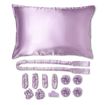Innehåller fem silkesbågar i två olika storlekar, tillhörande stopp som håller bågarna på plats, två hårsnoddar, en hårklämma och ett satinvävt örngott