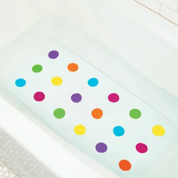 Munchkin Dandy Dots Badkarsmatta är en praktiskt badmatta att lägga i badkaret för att minska risken för halka. Mattan har ett bra fäste med sugproppar på undersidan som gör det enkelt att placera och ta bort vid användning. Rolig design med färgglada prickar. Mått: 77,5x36 cm.