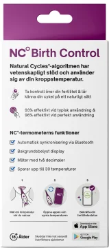 Natural Cycles Birth Control+NC° Termometer är ett digitalt och naturligt preventivmedel som inkluderar en termometer och en 3 månaders app-prenumeration. Natural Cycles algoritm har vetenskapligt stöd och använder sig av din kroppstemperatur. Metoden hjälper dig att hålla koll på fertilitetsdagar och lär känna din cykel. Termometern synkroniseras med din telefon via bluetooth, vilket gör det enkelt att hålla koll på din temperatur. Termometern mäter med två decimaler och sparar upp till 30 temperaturer. Den har bakgrundsbelyst display och valfri ljudsignal. Kan användas tillsammans med kompatibla "wearables" (bärbar teknik), som Oura Ring och Apple watch. Sover du med din "wearable" kan du synka med appen direkt när du vaknar. Passar från 18 år.