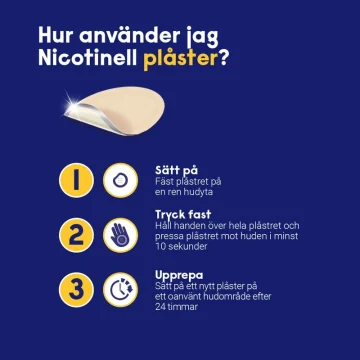 Vilken styrka ska du börja med: De som röker mer än 20 cigaretter/ dag rekommenderas att starta behandlingen med ett plåster Nicotinell depotplåster 21 mg/24 timmar För de som röker mindre än 20 cigaretter om dagen är det lämpligt att starta behandlingen med Nicotinell depotplåster 14 mg/24 timmar Nicotinell depotplåster 7 mg/24 timmar används vid dosminskningen i slutet av behandlingen. Fäst plåstret på en ren, torr, hårfri och oskadad hudyta. Byt plåster efter 24 timmar. Fäst inte plåstret på samma ställe två gånger i följd. Det bör gå en vecka innan samma hudyta används igen.