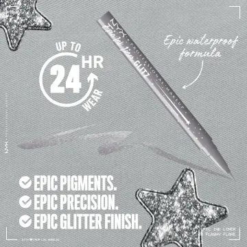 NYX Professional Makeup Epic Ink Waterproof Eyeliner Pencil är en vattenfast flytande eyeliner med en smal och flexibel penselspets som ger en exakt applicering. Eyelinern är högpigmenterad och de intensiva pigmenten glider lätt över huden och ger en täckande linje i ett svep. Penseln kan ge både tunna och breda linjer tack vare den flexibla spetsen. Vattenfast formula som håller i upp till 24 timmar efter applicering. Finns i flera nyanser med och utan glitter. 1 ml.