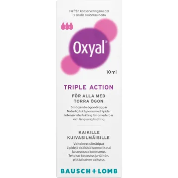 Oxyal Triple Action är en smörjande ögondroppe som stärker tårfilmens alla tre lager för att förbättra den mjukgörande effekten på ögats yta vid torra ögon. Oxyal Triple Action är utformad att stanna kvar på ögats yta för att ge en intensivt smörjande effekt för direkt och långvarig lindning. Det är en ideal produkt för alla som lider av olika symtom på torra ögon så som trötta, stressade, grusiga, brännande och/eller rinnande ögon. Enkel applicering med hjälp av en ”airless” pump vilket möjliggör att produkten är utan konserveringsmedel och med 6 månaders hållbarhet. 10ml.