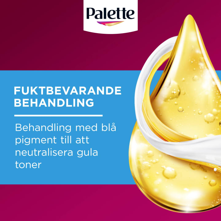 Palette Intensive Creme Coloration är ett permanent färgningskit som ger kristallklart blont hår. En permanent blondering för blont hår med Anti-Yellow effekt. Blonderingen med oljor tillför uppljusande ämnen till hårfibrerna och ger ett långvarigt blont resultat. Den bleker i upp till 9 nivåer och innehåller en specialutvecklad behandling med blå pigment som ger en återfuktad känsla i håret. Den uppljusande behandlingen hjälper till att neutralisera de gula tonerna. Efter behandlingen känns håret hälsosamt, lent och lättkammat. OBS! Denna nyans är inte avsedd för mer än delvis grått hår.