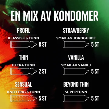 - Kondomer med olika passform, tunnhet, struktur och arom i glidmedlet