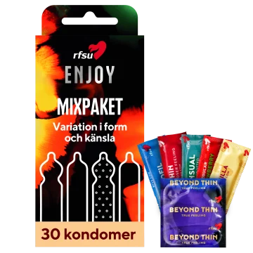 RFSU Enjoy Kondom är en mix av olika typer av kondomer. RFSU Enjoy passar dig som vill testa något nytt eller söker variation. Förpackningen innehåller kondomer med olika passform, tunnhet, struktur och arom i glidmedlet. Samtliga kondomer är tillverkade i naturligt latexgummi. 30st. Innehåll: 8 x Profil 2 x Beyond Thin 5 x Thin 5 x Sensual 5 x Strawberry 5 x Vanilla