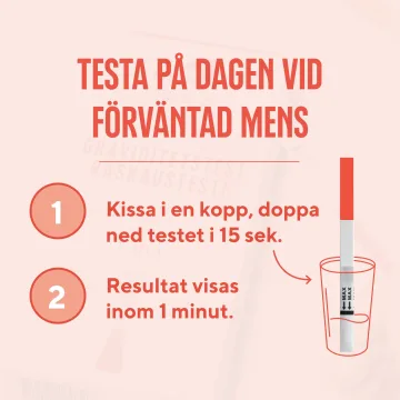 Du kan göra testet fråm och med den dag du skulle haft mens. Du kan testa när som helst under dygnet men säkrast är att mäta morgonurinen, då hCG-koncentrationen är som högts. Testa med morgonurin, samla upp i en behållare. Doppa stickan i behållaren i 15 sek, vänta 1-5 minuter för besked.