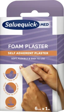 Salvequick MED Foam Plaster är ett självhäftande plåster utan lim eller latex. Korselastiskt bandage som absorberar blod och ger god kompression vid sårskador och kan fästas direkt på sår utan att fastna eller skapa obehag. Vattenresistent och sitter på plats även om det blir blött. Klipps till önskad längd. 6 cm x 100 cm