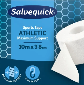 Salvequick Sports Tape Athletic Maximum Support är en icke-elastisk bomullstejp med hög fästförmåga. Sporttejpens begränsade rörlighet ger stöd vid skador på leder, muskler och ligament - exempelvis sträckningar och stukningar. Används även för fixering av kompress/bandage. 3,8 cm x 10 meter.