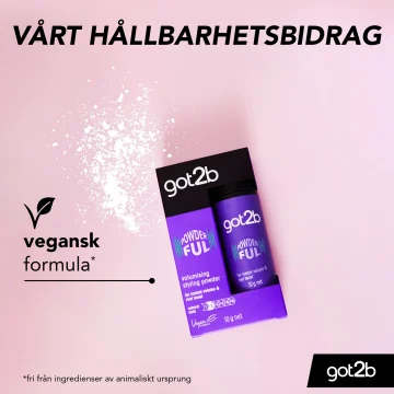 Vegansk1. Skaka ut en mindre mängd i handflatan och gnugga sedan handflatorna mot varandra. 2. Applicera sedan hårpudret i torrt hår och fördela det från rötterna till topparna för en omedelbar volym i håret. Tips: För en extra volymboost kan du skaka ut pudret direkt på håret och fördela det från rötterna till topparna.