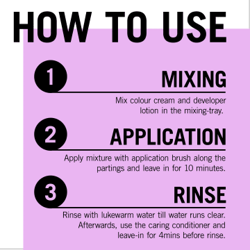 Användning: 1. Häll innehållet i Schwarzkopf hårfärgningskräm och utvecklarlotion i blandningsskålen och blanda väl. 2. Applicera blandningen med appliceringsborsten i de mest synliga rötterna och låt produkten verka i 10 minuter. 3. Skölj med ljummet vatten tills sköljvattnet är helt klart. Använd sedan Care Conditionern som medföljer i förpackningen.