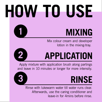 Användning: 1. Häll innehållet i Schwarzkopf hårfärgningskräm och utvecklarlotion i blandningsskålen och blanda väl. 2. Applicera blandningen med appliceringsborsten i de mest synliga rötterna och låt produkten verka i 10 minuter. 3. Skölj med ljummet vatten tills sköljvattnet är helt klart. Använd sedan Care Conditionern som medföljer i förpackningen.