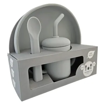 - Innehåller tallrik med kanter, sked och mugg med sugrör