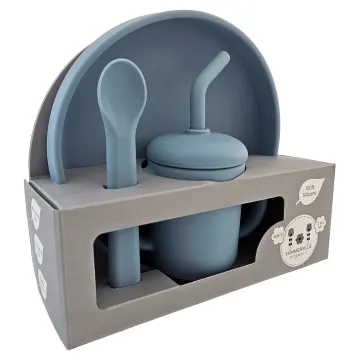 - Innehåller tallrik med kanter, sked och mugg med sugrör
