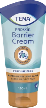 TENA Barriärkräm är en mild och transparent kräm som skapar en skyddande barriär som motverkar irriterad hud. Innehåller naturliga oljor och vitamin E. Applicera ett tunt lager på det hudområde som ska skyddas. Speciellt lämplig vid inkontinensvård. Oparfymerad. Svanenmärkt. 150 ml.